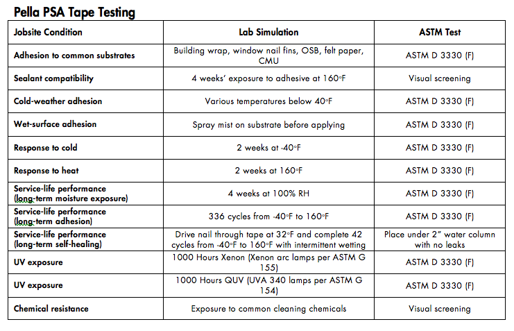 Vos relates, “We tested a number of adhesives and backing options in an approach similar to AAMA 711 (although during initial Pella testing, AAMA 711 was not yet available). While it is difficult to say how many years of service life is simulated by any one of these tests, or how many other conditions we could try to simulate, we certainly spent some time and effort evaluating PSA tape materials.”