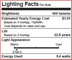 New packaging for replacement lamps prominently displays lumen output, estimated annual energy costs, and lifespan. This should make it easier for consumers to find the amount of light they prefer and compare products, but it will take some getting used to (see table for lumen equivalents), and they might have to calculate lumens per watt on their own.