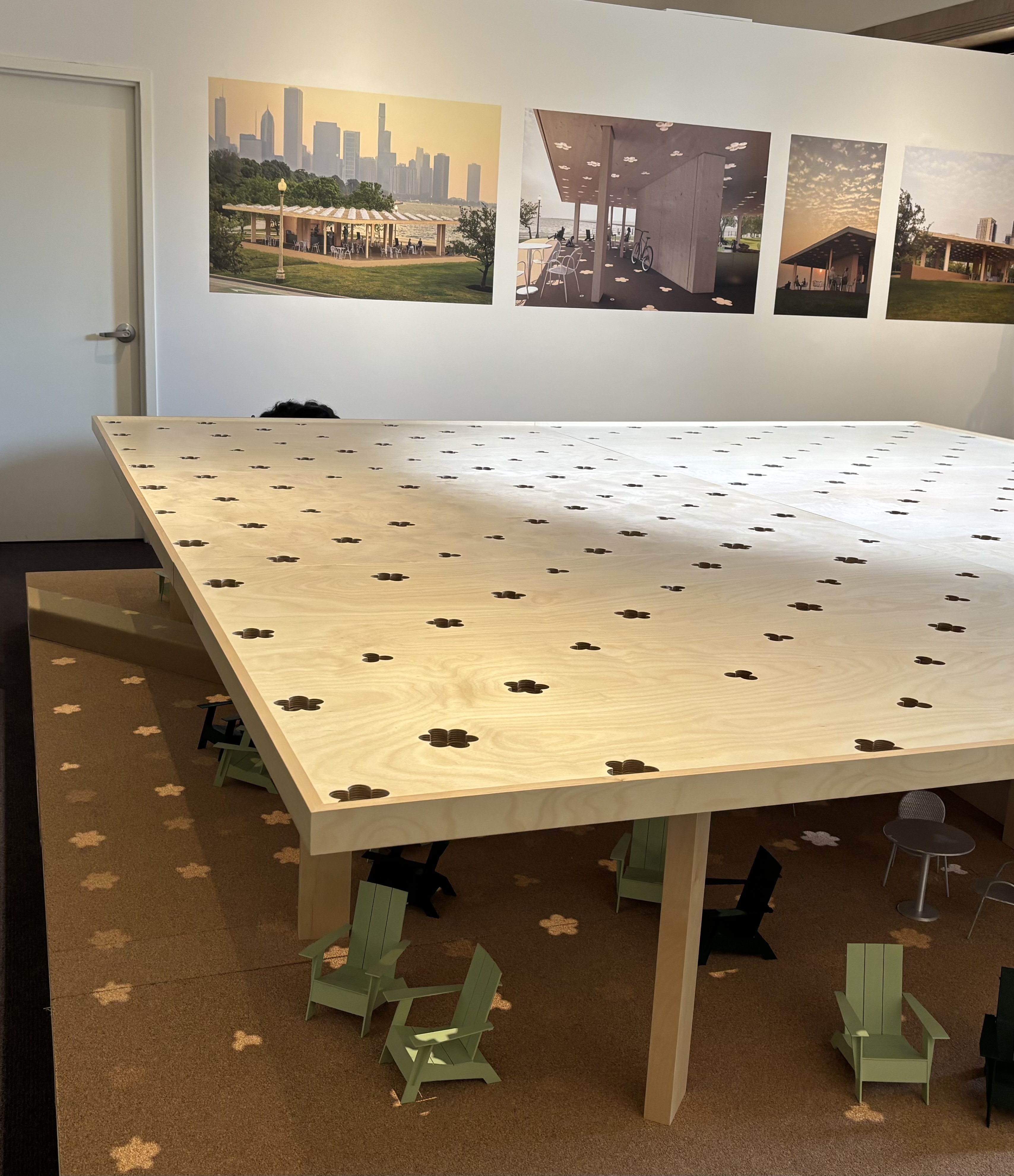 Environmental-centric design tied with inviting a sense of community was displayed in a more static, but still very flexible design in another installation in the Chicago Cultural Center. The piece is titled: Forget-Me-Not Pavilion by Kwon Von Glinow architecture practice, another communal concept to extend the life of a currently standing structure north of Museum Campus on the lakefront. The current structure, a cross-laminated timber design titled the Chicago Horizon Pavilion, would have 200 flower-shaped openings cored through the roof and sealed with clear acrylic domes. There would be a new permeable cork ground as well as a cork-clad bench extended out from under the canopy. Flower-shaped lighting would shine through onto those who gather underneath.
