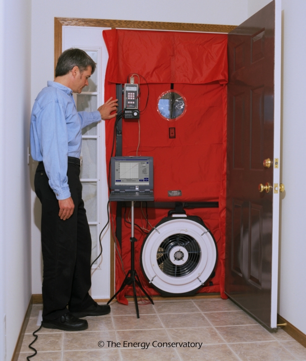 I did some asking around and hired Dick Cartelli (a.k.a., The Draft Detective) from Putney, Vermont to figure out what was going on. He came in with his "blower door" and tested the home's leakiness. A blower door is set up in an exterior door frame and turned on to pressurize the house (pictured with this blog is the Minneapolis Blower Door from industry leader The Energy Conservatory). By measuring how much air is being pushed through the blower door and measuring the pressure difference between indoors and out (using two manometers), the operator can calculate the air tightness of the house--usually in "air changes per hour" at the elevated pressure of 50 pascals.