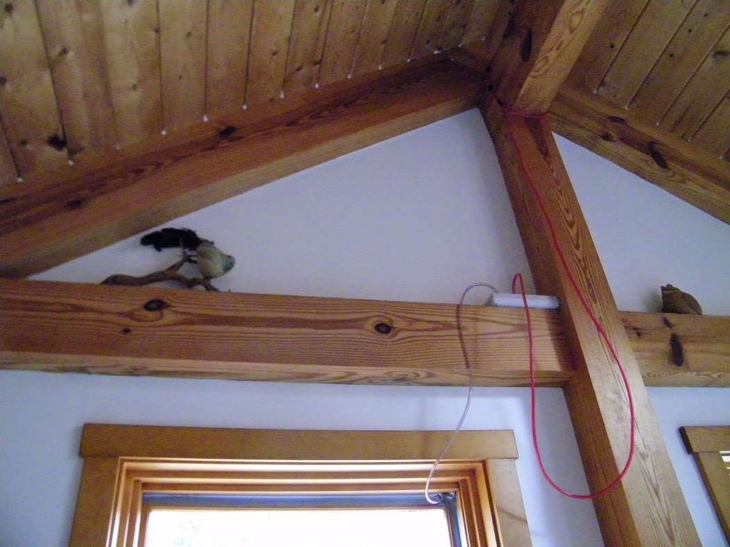 An infrared camera (operated while a blower door is depressurizing the building) shows air leaks along the timber-frame rafters, right where the SIP joints are, exterior to the tongue-and-groove deck and 6-mil poly.