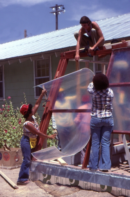 An attached solar greenhouse construction workshop in New Mexico in the late-1970s. Photo: Alex Wilson. Click on image to enlarge.