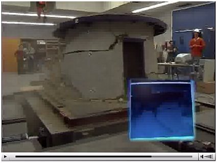 I'd be very interested to see strawbale get the shakes. There have been a few crunch tests done, but nothing like this yet, to my knowledge.Also see this video from the Getty Seismic Adobe Project: and the article When the Earth Moves: The Getty Seismic Adobe Project. Another video, from GVTV, in addition to offering a couple technical misstatements for the sharp-eared, shows some of the Vancouver testing. A couple interesting further reads are the articles Making the Building Code Work for Cob by architect John Fordice, and Some Thoughts on "Adobe Codes" by seismic engineer Fred Webster.