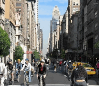 The video asks--"could we spend the next four years growing our cities?" and shows green roofs on everything; it asks, "in four years, could Manhattan look like this?" and shows the street filled with bikes.