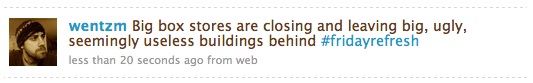 To respond to my posts, just tweet "@wentzm [your message] #fridayrefresh". To follow the conversation, even if you are not on twitter, go to http://search.twitter.com/search?q=%23fridayrefresh