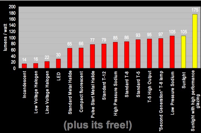 Leave it to an engineer to tell us how much that sunlight actually costs us. Lumens per watt (lpw) is the measure of lighting efficacy, telling us how much light (lumens) we get out for how much power (watts) we put in. The chart below shows typical efficacies of different lighting technologies, including incandescent (14), LED (30–50), T-5 fluorescent tube (95), and more.