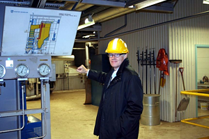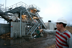Plant engineer Henrik Mattsson showing off the chip sorting facility at the plant. Chips are screened at the C4 plant, and larger pieces of wood that might jam the auger feeders are separated out (on the lower left).