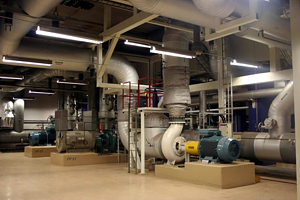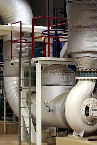 Power generation components in the C4 plant. The square unit on the right is the electric generator, and the unit with black corners and door houses the gearing that converts the steam turbine's high-speed shaft rotation to a more moderate speed for use by the generator.