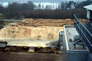 Piles of stored chips at the C4 plant. Steam can be seen rising from the middle pile — as a result of heat from decomposition, which sometimes occurs. Occasional fires break out.