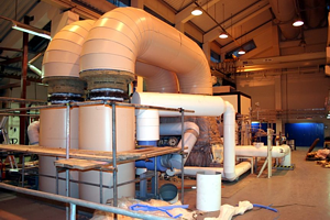 Rather than being distributed directly, it heats water in a 40,000 cubic-meter (10.6 million gallon) insulated tank (accumulator), from which hot water is drawn off to supply the district heating network. The insulated pipes leaving the plant (district heating is always provided through paired supply and return pipes) are 80 centimeters (31 inches) in diameter. Further from the plant, the pipe diameters drop as they branch and as feeds go off to heat buildings. At individual single-family houses, the pipe diameters are as small as 15 mm (0.6 in). There is typically a 50°C (90°F) delta-T (difference in temperature) between the outgoing and return water. Water leaves the plant at about 100°C (210°F) and returns at about 50°C (120°F). So that's a quick lesson in CHP and district heat. For more on this, visit our feature article on the topic (Vol. 16, No. 3). I was struck, on visiting the two plants, by just how organized and clean they were. Perhaps it has to do with power plants — I haven't visited others of this scale — but more likely I suspect it's because of the Swedish attention to detail, order, and cleanliness. You could have eaten off almost any of the floors in the two plants!