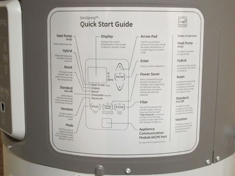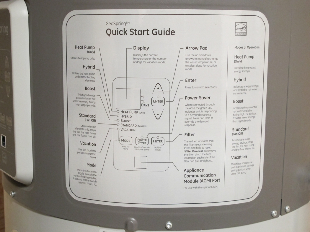The GeoSpring offers several different control options: heat pump only, hybrid (both heat pump and electric resistance — less savings than heat pump only), boost (faster water heating and less savings than hybrid), standard (electric-resistance only — no energy savings), and vacation (maximum savings when homeowners are away).
