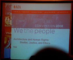 But what gives me the right to gripe about the choices other people make? I left a session earlier in the day myself, about three-quarters of the way through. (I'm not an AIA member, though.) Called "Architecture and Human Rights: Shelter, Justice, and Ethics," it was a fine presentation to the half-full room — just not what I expected. The program description said, "The AIA Code of Ethics states, 'Architects should uphold human rights in all their professional endeavors.' But have we, or our projects, ever crossed the line? What needs to be done to fully deliver on the promise of universal human rights in the built environment? Can a building itself violate human rights? Speakers from architecture and legal organizations will consider the intersection of architecture practice and international norms of justice in today's increasingly complex world."