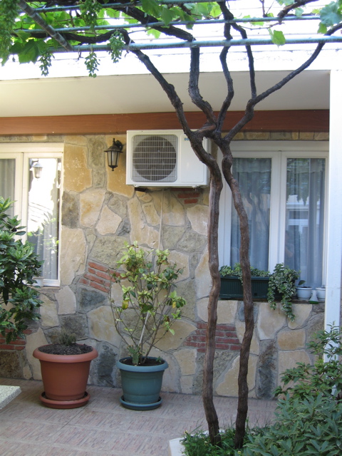 (The photo is from T'bilisi, in the Republic of Georgia. It shows an exterior unit that provides cooling to an indoor air handler at a hotel. Condensate is piped down to a potted plant -- a nice touch.)