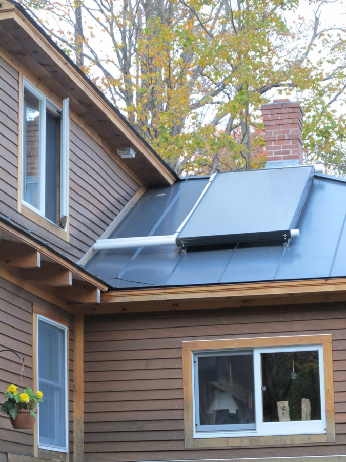 This solar water heater on a Guilford, Vermont home is augmented by a heat exchanger in the wood stove, which offers back-up water heating in the event of a power outage--relying on passive thermosiphoning. Photo: Alex Wilson. Click on image to enlarge.