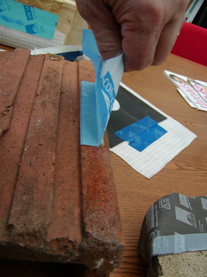 "Benchtop" testing of a Pro Clima PSA tape on a terra cotta drainage tile (using Pro Clima primer).