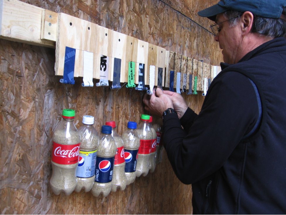 In February 2014, WTF started a new round of “ASTM D3654 – Method A-like” testing. We’re going to look at Pella, OC FlashSeal IR, Tyvek, Siga Wigluv, and ZIP tapes on four substrates: rough OSB, Tyvek housewrap, XPS, and foil-faced polyiso (Our SEON builders and architects really wanted to see popular tapes, such as Tyvek and ZIP, tested on a wide variety of substrates, not just the ones for which they were designed). Fixing our mistake with the weights, we’re coming down to one-pound weights, and a new clip attachment that won’t produce the same stress. We're testing with cold-damp application and damp-warm tempering.