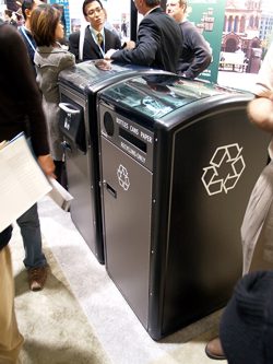 Big Belly Solar compacting public trash cans and recycling kiosks. I saw these things last year, maybe even the year before, and they're still a favorite. The real savings they can offer aren't immediately apparent under the glare of novelty. They increase capacity by five times over ordinary receptacles of the same size; and they signal wirelessly for pick-up when full, further reducing — by lots — the emissions generated and energy expended for pickups. The standard black side panels and hopper cover are made from 80-100% post-consumer recycled ABS. The exterior is 85% recycled galvanized steel (which is about normal for steel anyway).