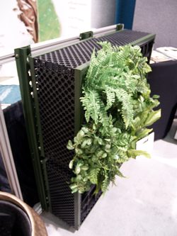 Tournesol VGM modular green wall planting system. No PVC! Their grid is 100% recycled polypro, with a steel mounting system. The soil depth... er, thickness... is a choice of either 4.5 or 8.5 inches — unusually generous for living wall systems, and great for the plants. This is a brand-new product that they rolled out at this show; it's not even on their website yet.
