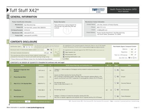 This sneak preview of the HPD for the imaginary "TuffStuff X42" should give you a sense of what the document will include. For a PDF of the full HPD, click here.