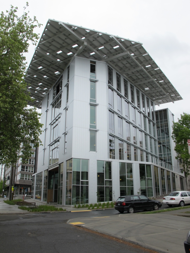 The new Bullitt Center with its cantilevered cap of PV modules.