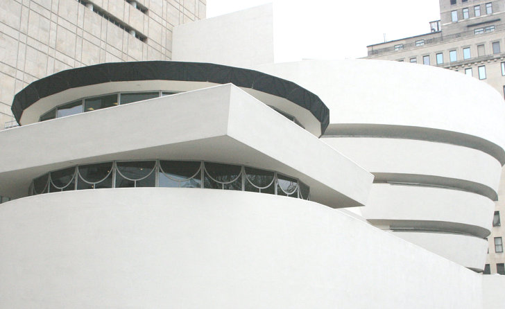 The striking rotunda of the Frank Lloyd Wright Guggenheim museum in New York City places all of the art in concave exhibition niches on the exterior of the building. The sloped floor and wall junction created a void and thermal bridge at this junction (see detail and photos below), which led to moisture and discoloration problems on the interior.