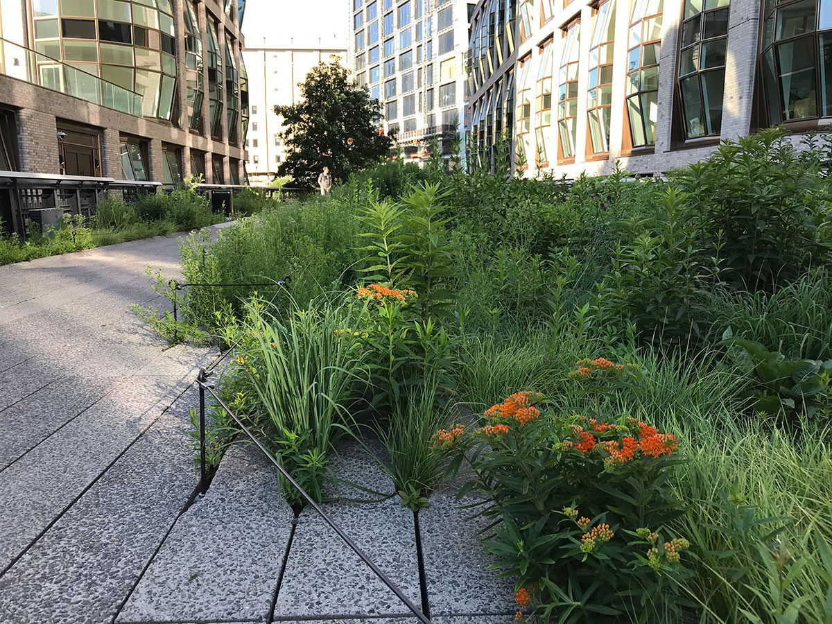 Gardening staff work hard to keep invasive plants out of the High Line plantings. During a several-minute walk on the High Line in mid June, 2014, entomologist Doug Tallamy spotted four different pollinator bees foraging on butterfly weed, and he saw three Monarch butterflies—the first he had seen anywhere in the East that year.