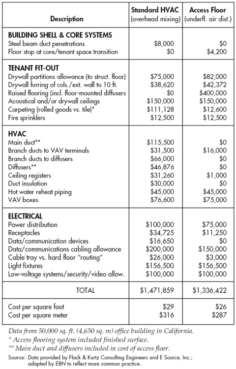 Because air distribution access floor systems are still relatively new in the United States, there is little data on costs and measured savings. Flack & Kurtz Consulting Engineers compiled cost information for both a conventional HVAC system and an access floor system for a 50,000 square-foot (4,650 m2) building in California (see table).