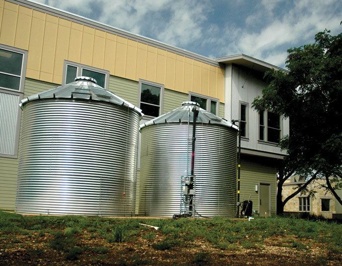 Two 8,000-gallon (30,000-l) cisterns outside the Sally Cheever Girl Scouts Leadership Center in San Antonio, Texas, store both rainwater and air-conditioner condensate, which are then used for irrigation. Even during dry spells, the air-conditioner condensate provides enough water to irrigate approximately 1.5 acres (0.6 ha).