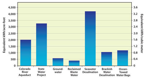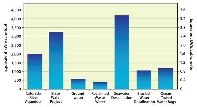 From an energy and environmental standpoint, desalination has a number of drawbacks. First, it is energy intensive, even where RO technology is used instead of evaporation. Current best practices with RO require about 12 kWh per 1,000 gallons (3.2 kWh/1,000 liters); with this energy intensity, between a third and a half of the total cost of desalination goes to energy. The figure below shows the relative energy intensities of various freshwater sources in San Diego, California. The high energy intensity of desalination in San Diego is comparable to that of Tampa Bay’s plant, which uses approximately 4,476 kWh/acre-foot (3.629 kWh/m3).