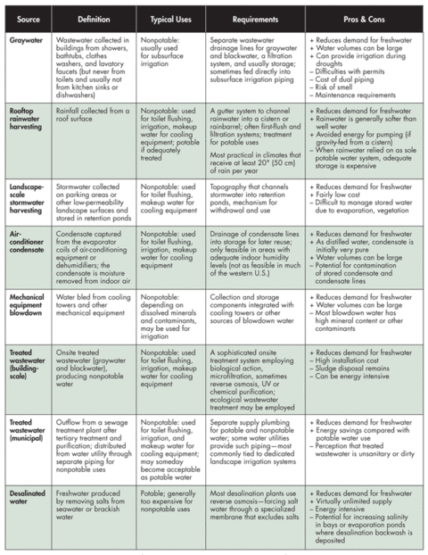 Described in this article and summarized in the table are the most prevalent alternative water sources for use in and around buildings. Scale of delivery can dictate what solutions to focus on. Graywater, for example, is typically dealt with only on an individual-building scale. With rainwater collection or air-conditioner condensate, it may be possible to aggregate water from several roofs in a university or office campus and use common storage, improving the economic viability of such systems. Using reclaimed water (treated wastewater) and desalination water is usually viable only when a municipality supplies that water.