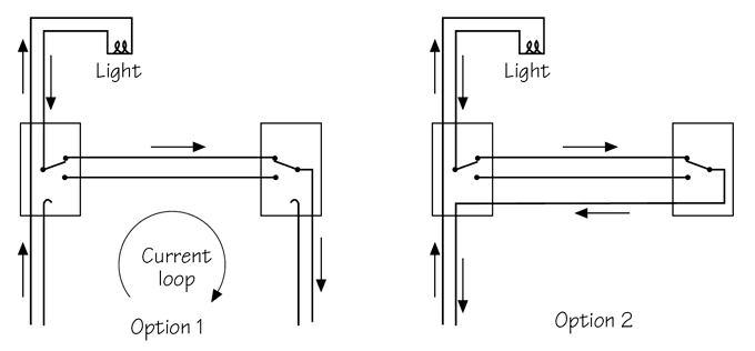 Figure 2. Two ways to wire three-way switches. Option 1, on the left, causes a current loop and enhanced magnetic field. Option 2, with three-conductor wire, does not.