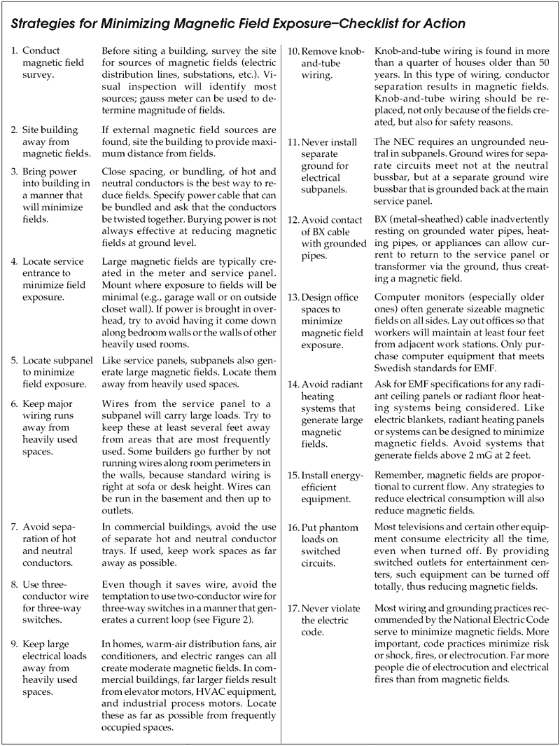 Simple, low-cost (or no-cost) steps can and should be taken during design and construction of buildings to minimize magnetic field exposure of building occupants (see checklist at end of article). This strategy is often termed