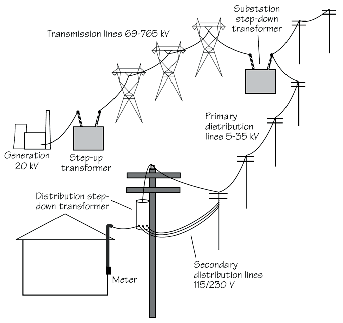 Figure 1. Electrical distribution systems. Transmission lines generate larger magnetic fields than distribution lines, but right-of-ways are usually wider, so distribution lines usually result in larger magnetic fields in buildings.