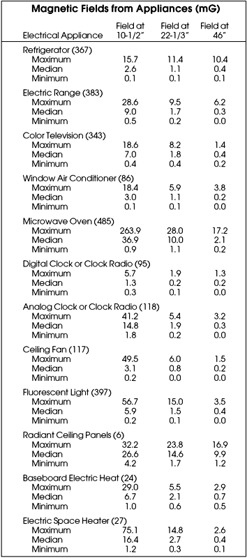 As mentioned previously, the magnetic fields resulting from electrical devices in buildings depend on device design and current flow. EPRI has undertaken extensive surveys of magnetic field sources in residential and commercial buildings recently. Magnetic fields produced from common appliances and other equipment are listed in the table.