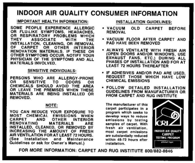 In an agreement negotiated with the EPA, The Carpet and Rug Institute (CRI) began a testing and labeling program in 1992. The program was widely criticized by consumer advocates and the attorney generals of several states for failing to warn consumers about potential hazards and for inadequate testing. The program was strengthened in January 1994.