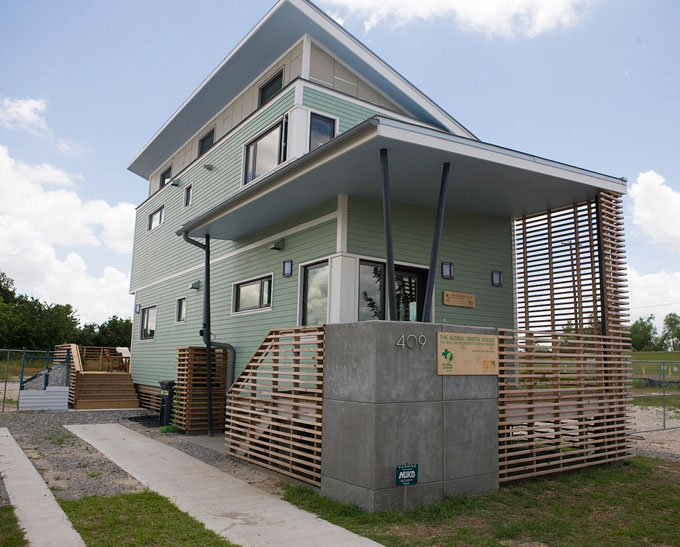 The homes built by Global Green in the Lower Ninth Ward of New Orleans are elevated to keep them above expected flood level. Numerous other “passive survivability” features are included.