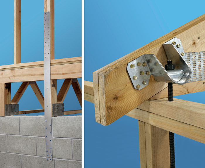 A wide variety of hardware is available for increasing resistance to strong wind. This product from Simpson Strong-Tie extends the load path in wood-frame construction, helping prevent uplift.