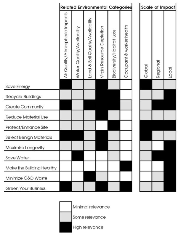 UPDATE: This keystone article was updated in 2010 to reflect changes in the industry.It is rarely possible to do everything we would like to reduce the environmental impact of building projects. It takes time to research alternative design and construction systems; new materials may not have proven track records; higher costs may be an impediment; or clients simply might not be interested. Therefore, it makes sense to figure out where our efforts will do the most good. Where should we focus most of our attention in designing and building structures that will have minimum impact on the environment?