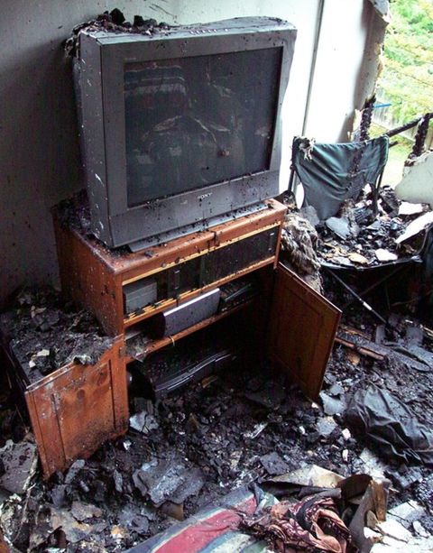 Damage from a candle-ignited fire that destroyed a campus fraternity house in Amherst, Massachusetts—brominated flame retardants probably prevented this television from fully igniting.