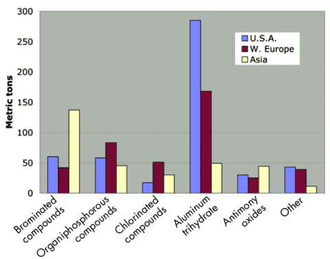 diluting the combustible material. (Noncombustible filler materials like gypsum also have this effect, but they aren’t categorized as flame retardants.)