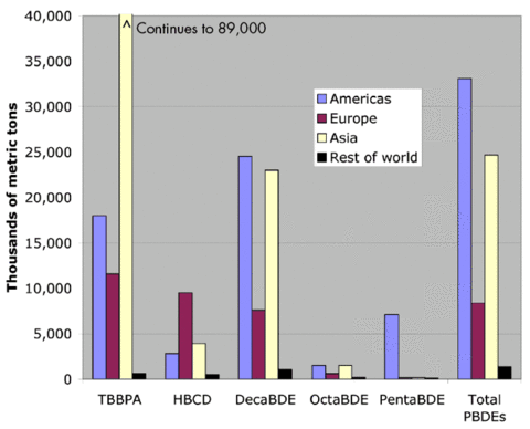 The manufacturers and industry associations representing these flame retardants tell us that the chemicals are safe, but weren’t they saying the same thing about PCBs and PBBs three decades ago? Meanwhile, we’re using orders of magnitude more brominated flame retardants today than we were when PBBs were banned.