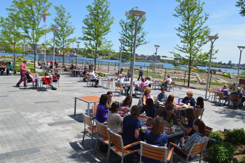 Effective public space takes on a whole new importance through a resilience lens. Here, Spaulding Rehabilitation Center encourages patients and neighborhood members to mix in outdoor, stress-free environments.