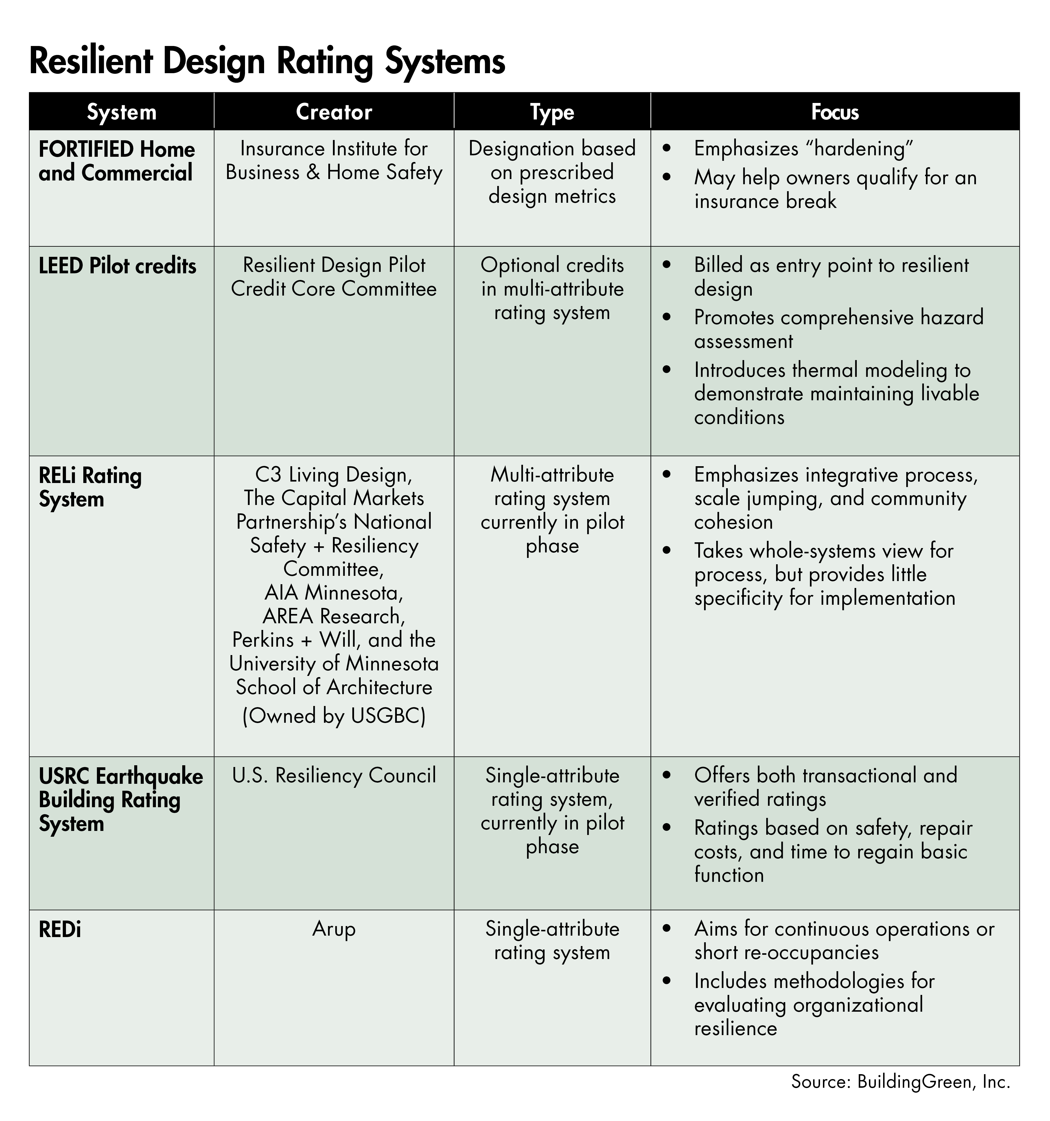 FORTIFIED programs have been around for the longest and are referenced in RELi, LEED, and REDi for many of the “hardening” aspects of resilience.
