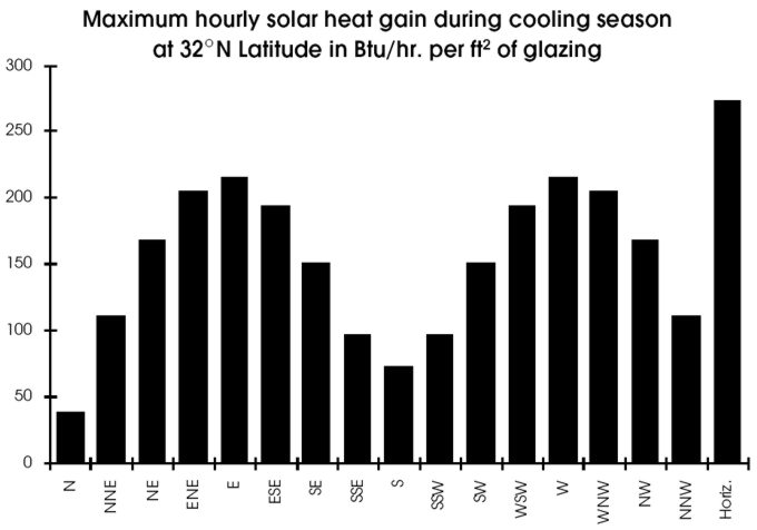 Figure 2: Solar intensity on vertical glazing facing different directions and on horizontal glazing (skylights). Figures are for maximum hourly gain during July. While most designers worry only about solar gain through west-facing windows, east-facing windows are almost as significant in their contribution to cooling loads.