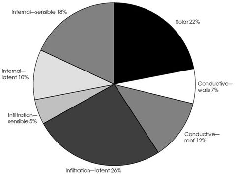 Distribution of typical residential cooling loads in Houston climate. These cooling loads are representative of a typical house that is not particularly energy efficient. A more energy-efficient house would have significantly reduced conductive and infiltration gains, and solar gains would represent a greater fraction of the total.