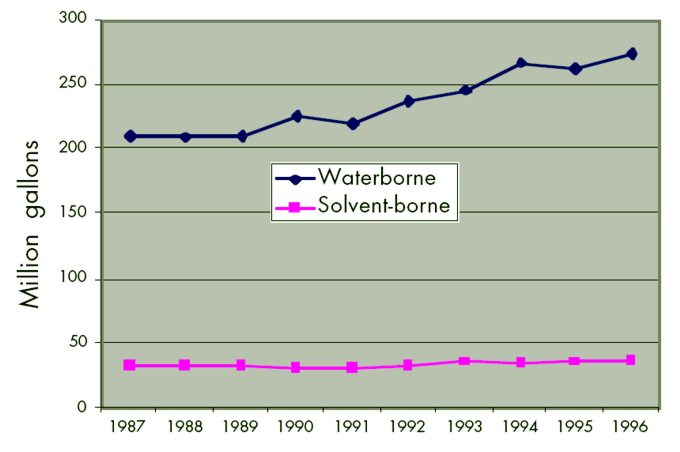 Roughly 1.2 billion gallons (4.5 billion l) of coatings were sold in the U.S. in 1996, with a value of $16 billion, according a report from the National Paint and Coatings Association (NPCA). Just over 50% of this market (by volume) is categorized as “architectural coatings,” which include paints, stains, clear sealers—anything applied to buildings or building components in the field, as opposed to factory-applied finishes. About 57% of the architectural coatings, or 365 million gallons (1.4 million l), were sold for interior use. While there are still many small paint manufacturers, the industry has been consolidating rapidly in recent years, so that the six largest makers now account for nearly 80% of the sales. These manufacturers, along with a handful of specialty, environmentally driven companies, are responding to rapid changes in regulations and market demand with an evolving array of products.