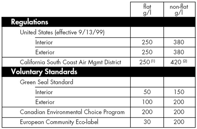There are other problems with relying on total VOC levels in a product as a toxicity indicator. VOCs come from a range of natural and synthetic sources, and those from either source can vary widely in their health effects. Many solvents traditionally used in paints are now being phased out due to their toxicity and potential carcinogenicity. The EPA maintains a list of hazardous air pollutants (HAPs) with stringent reporting requirements, and voluntary standards organizations like Green Seal have a list of chemicals that are not allowed in their eco-labeled paints.