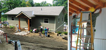 On the left, volunteers put the finishing touches on the Bensonwood Habitat house. On the right, workers install ceiling trim above a wall system that allows easy modification and installation of wiring.