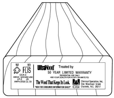 End-tag of pressure-treated lumber from CSI showing CCA Type-C treatment to .25 lbs./ft3 retention for above-ground use. “UltraWood™” also contains water repellants for added durability.
