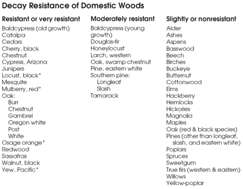 Traditionally certain decay-resistant woods have been used outdoors without treatment. Best-known among these are redwood and red cedar, though locust, cypress, white oak, and others have all been used in their native regions. Refer to table below for wood that might be available in your area. If these can be acquired from well-managed stands, they might be a good substitute for treated lumber. Even with decay-resistant species such as redwood and cedar, the sapwood has virtually no decay resistance, so be sure to use only heartwood when rot resistance is required. Also, there is some evidence that second-growth timber (with wider growth rings) has less decay resistance than old-growth timber.